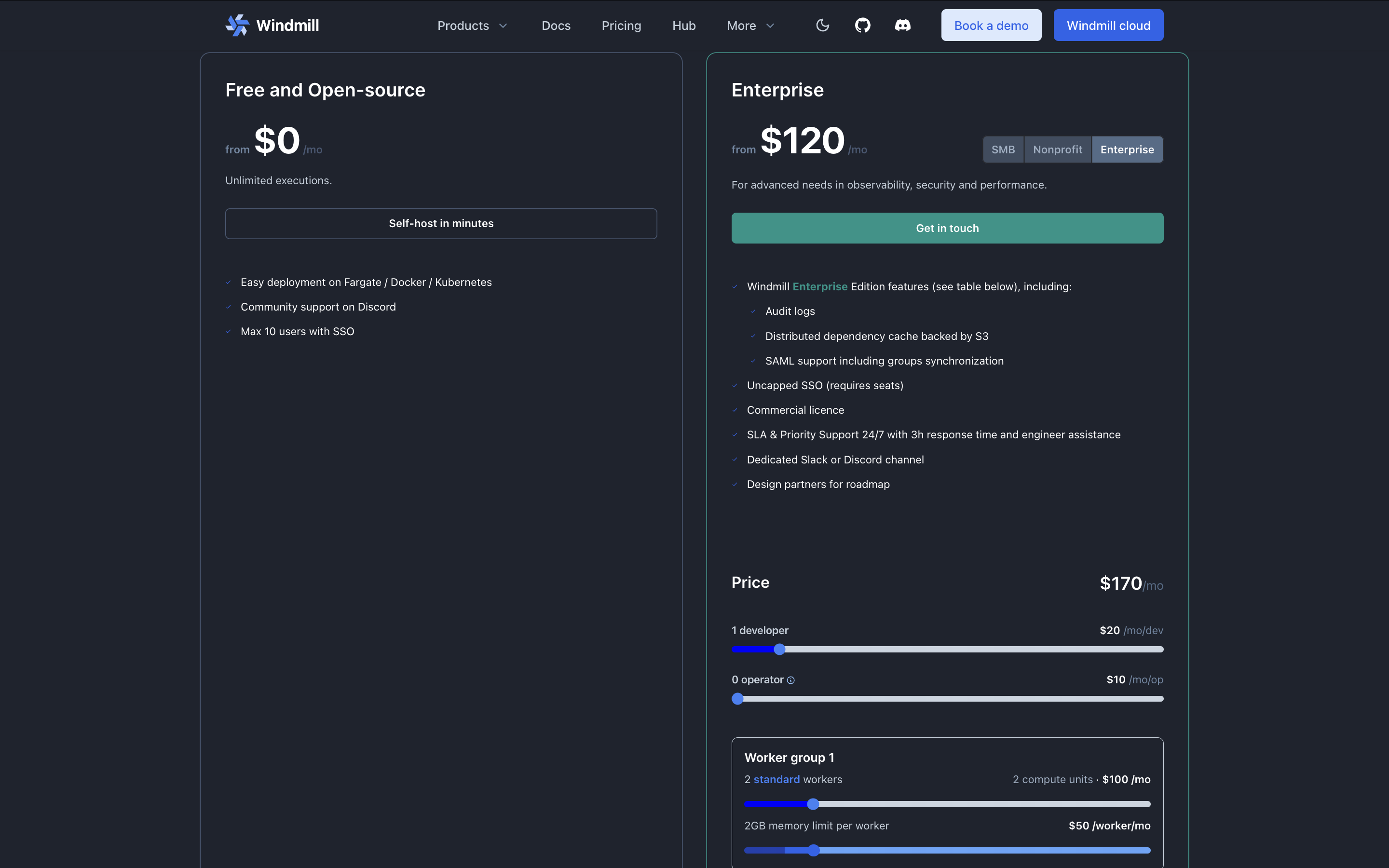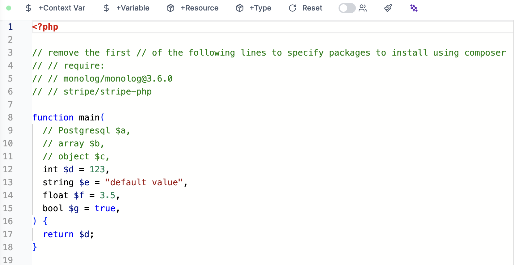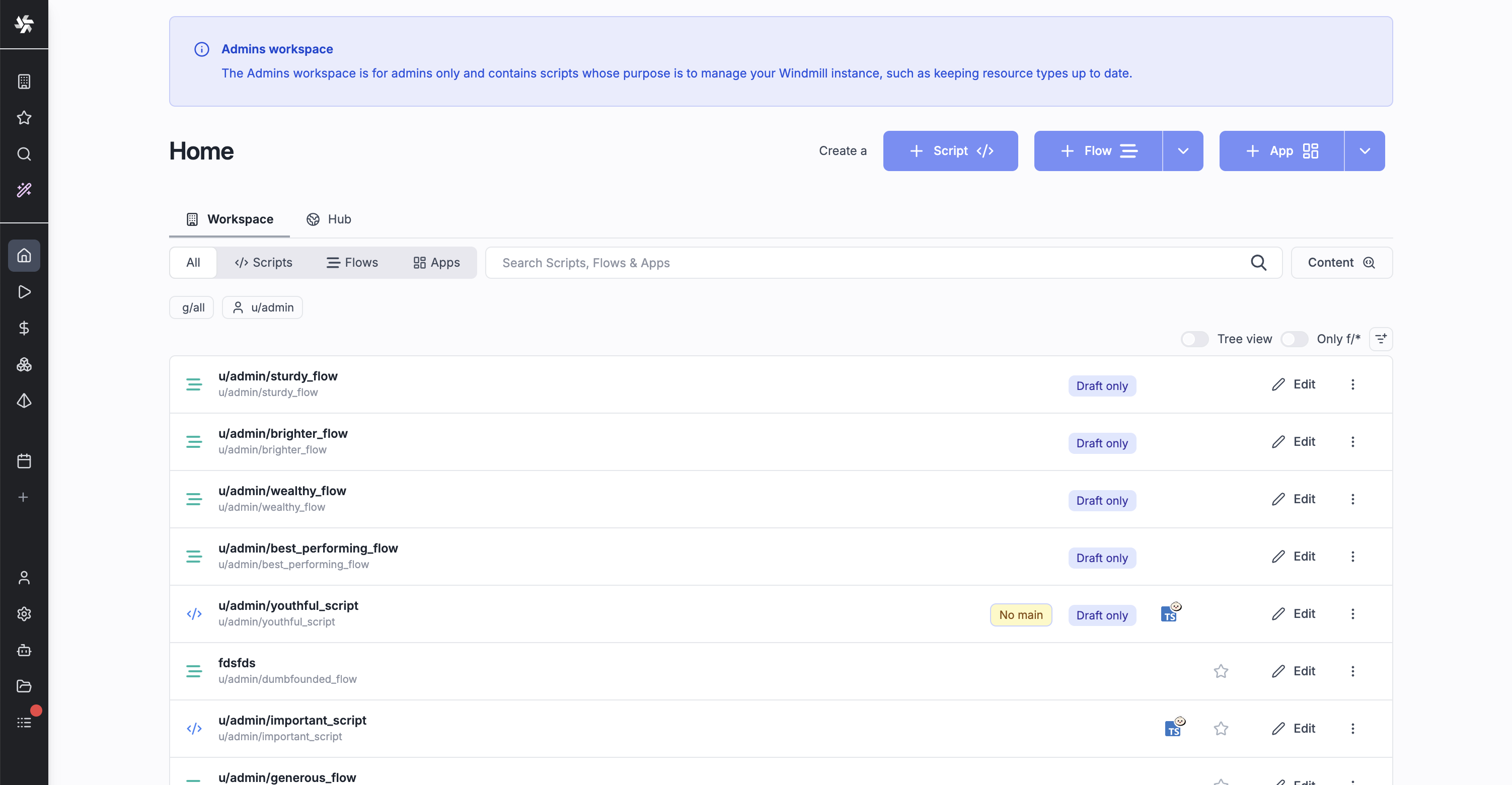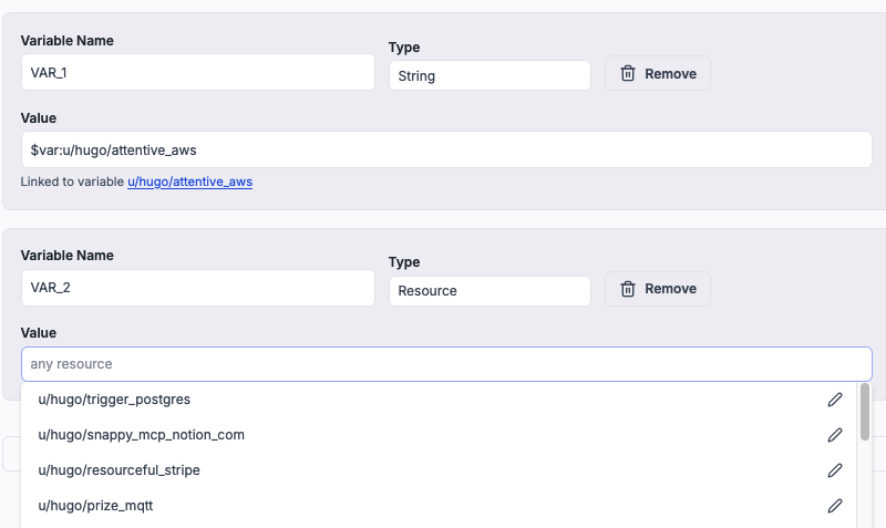 - Volumes: persistent file storage attached to scripts via comment annotations, synced to workspace object storage.