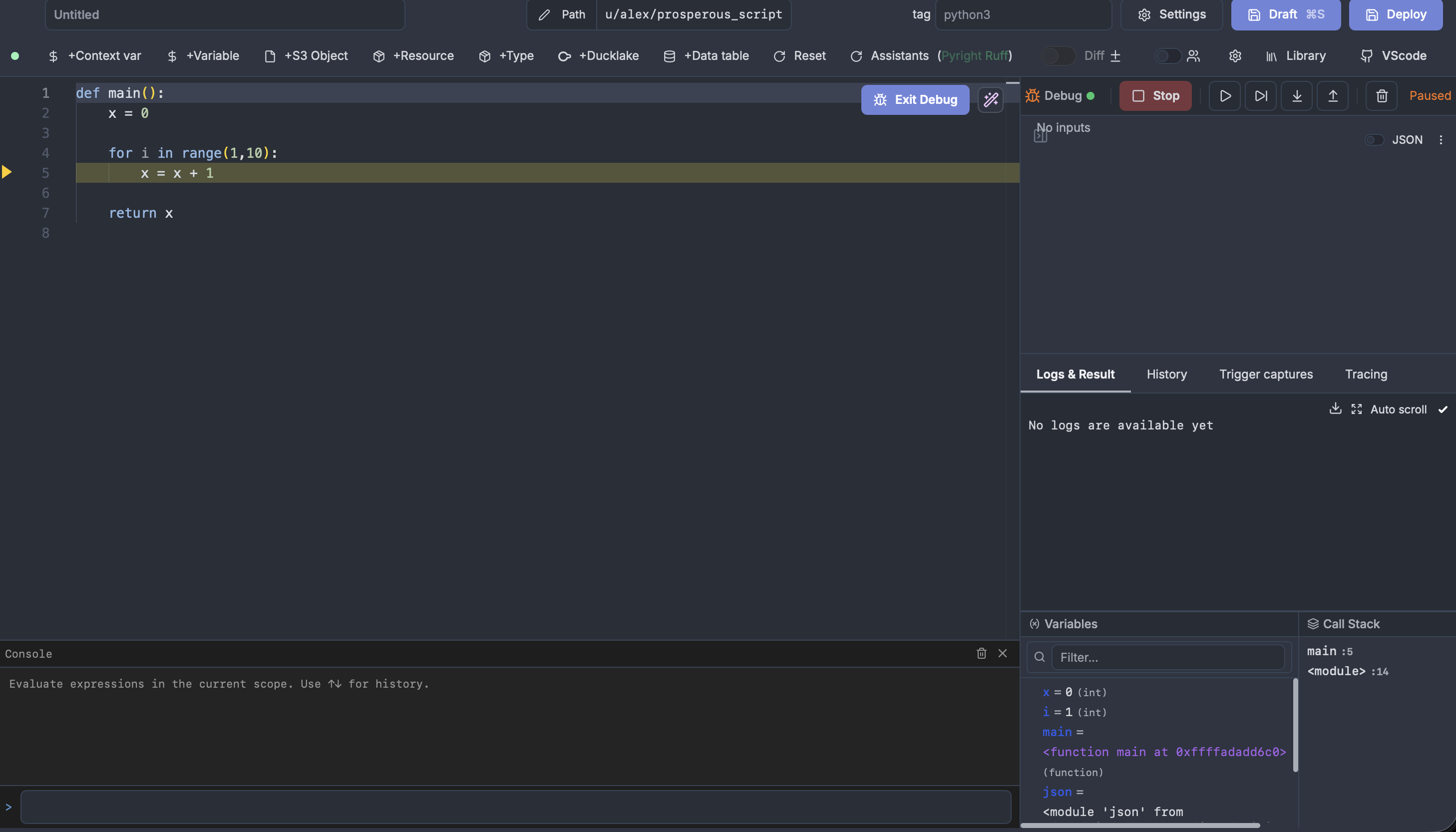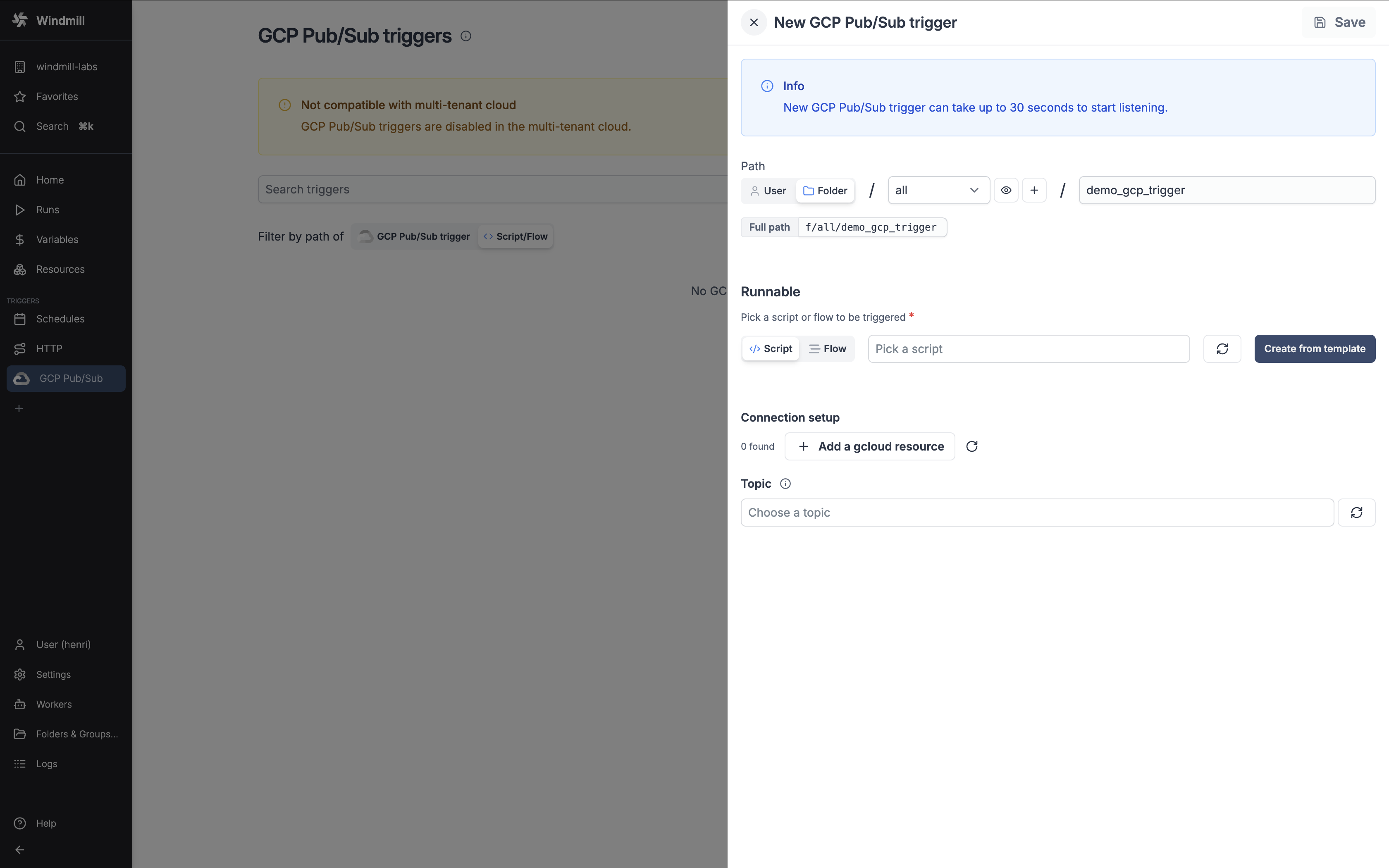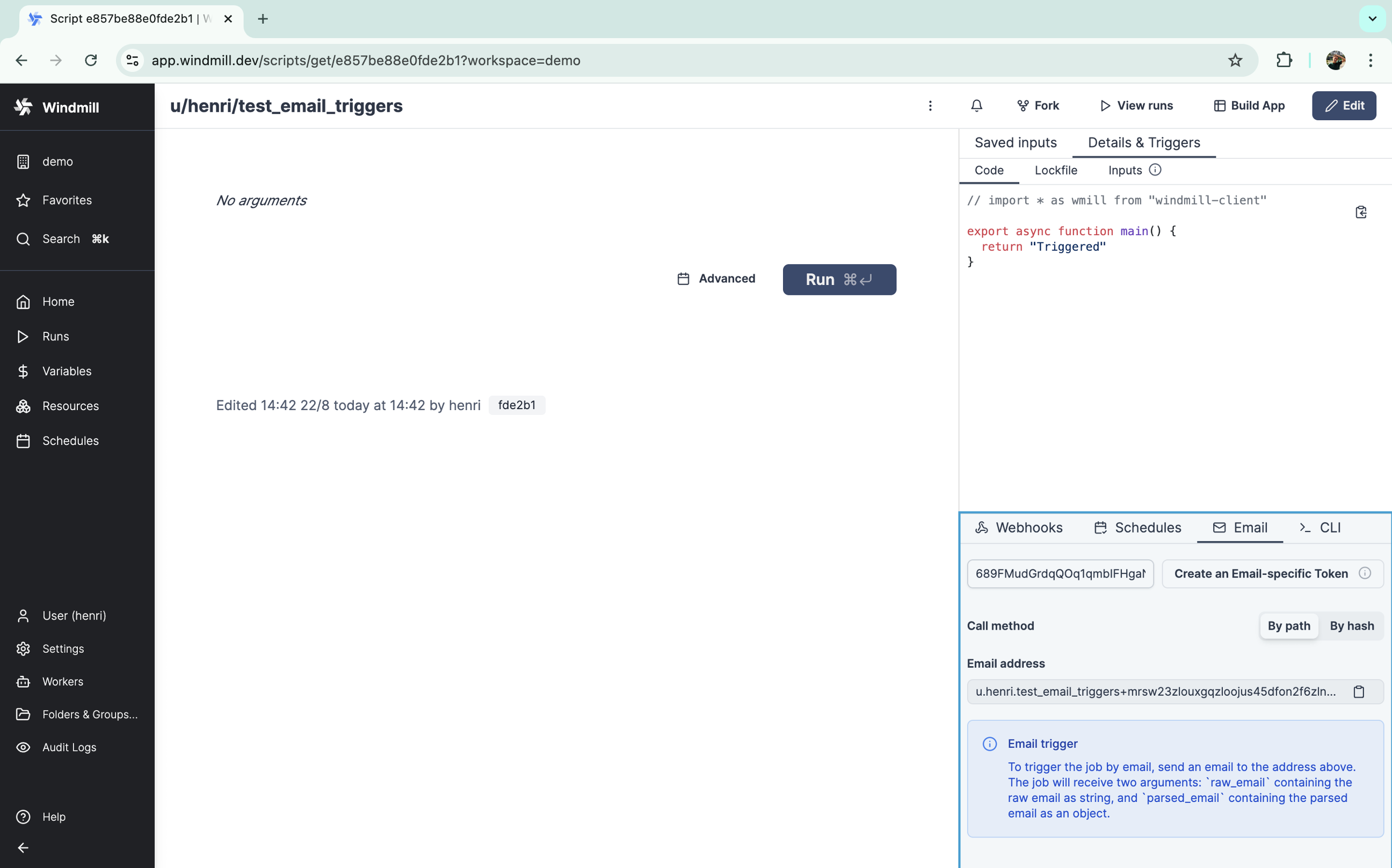 - Volumes: persistent file storage attached to scripts via comment annotations, synced to workspace object storage.